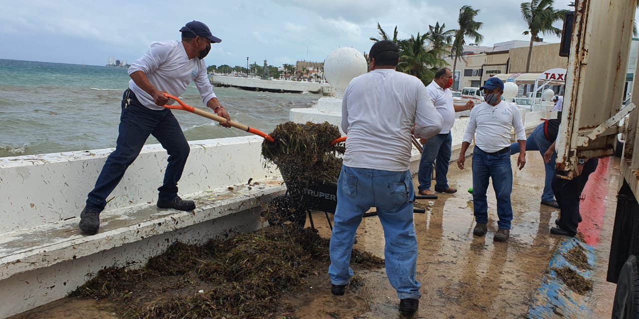 De manera manual, los trabajadores han estado retirando el sargazo acumulado, con la finalidad de despejar el espacio que utilizan los pasajeros para entrar y salir de la terminal marítima.