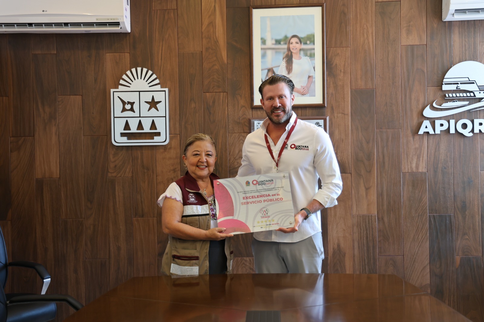 Chetumal.- Con la entrega de un nuevo Distintivo, la Secretaría Anticorrupción y Buen Gobierno del Estado (SABGOB) avala el compromiso de la Administración Portuaria Integral de Quintana Roo (APIQROO) con la Excelencia en el Servicio Público.